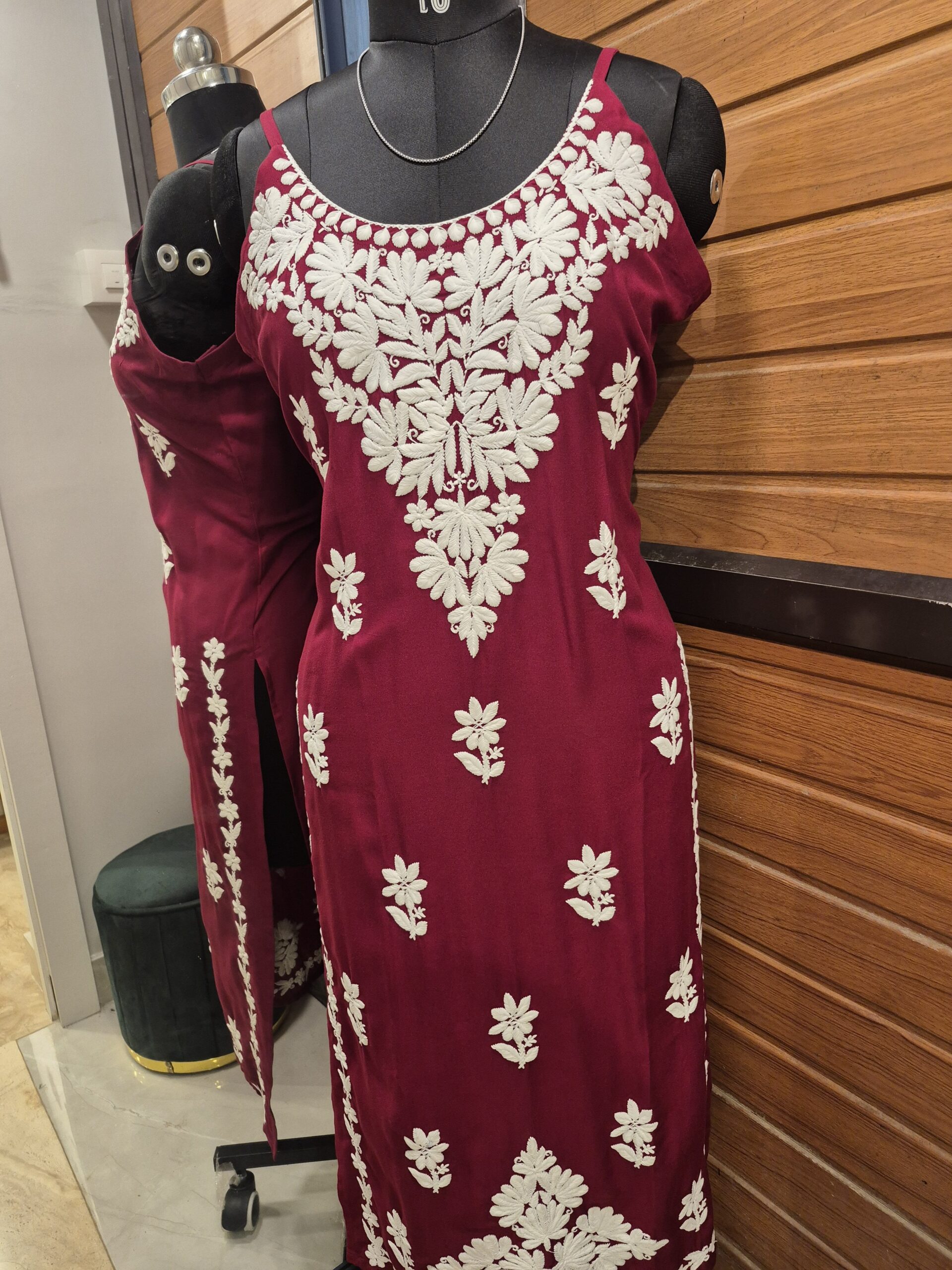 Hot selling handblock chickenkari Top, maroon colour, with delicate patterns.