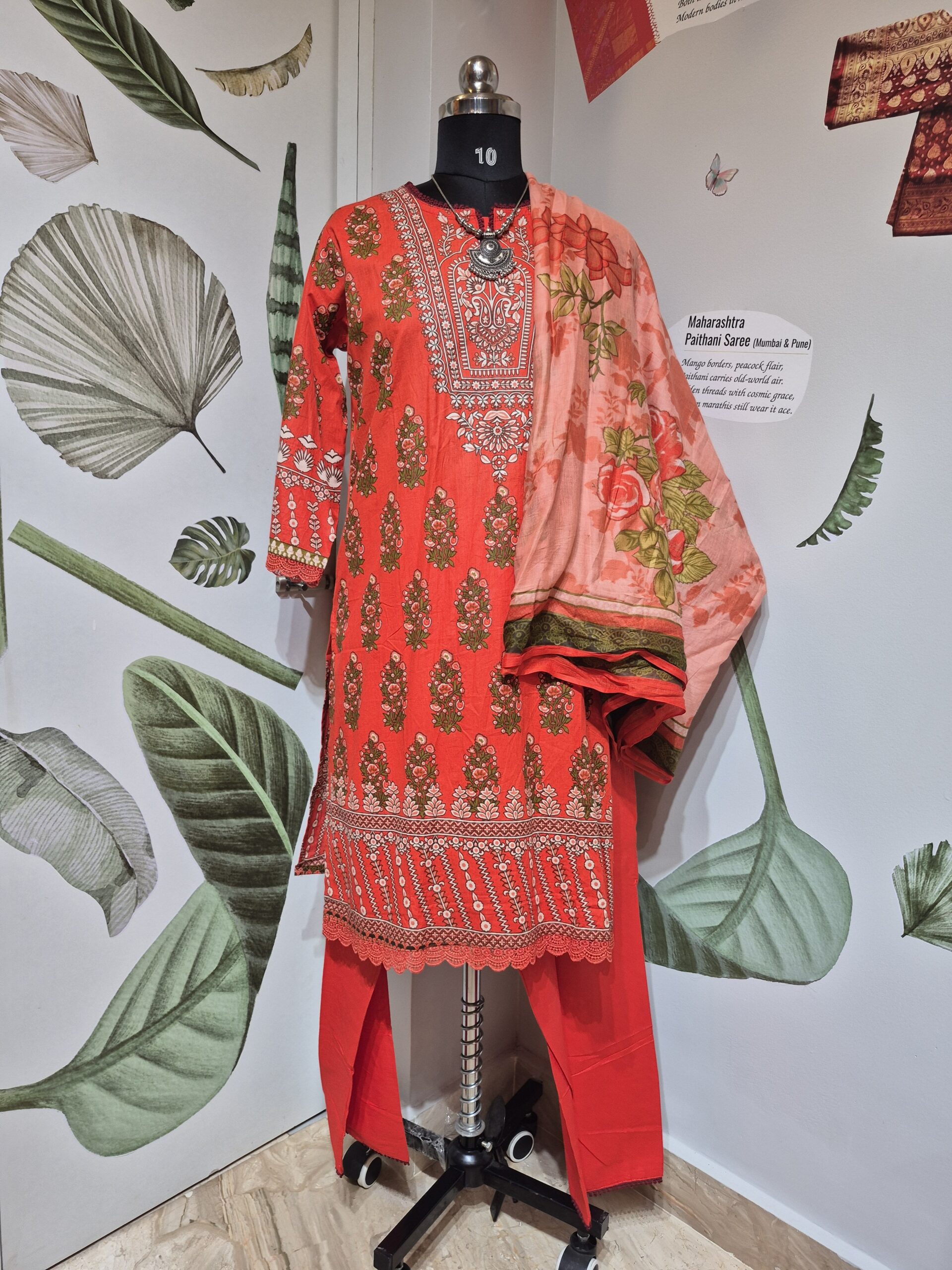 A vibrant orange Indian suit set featuring all-over floral print columns and an intricately detailed, embroidered-look yoke and hem border. It is paired with solid matching bottoms and a contrasting peach dupatta with large, artistic floral prints.