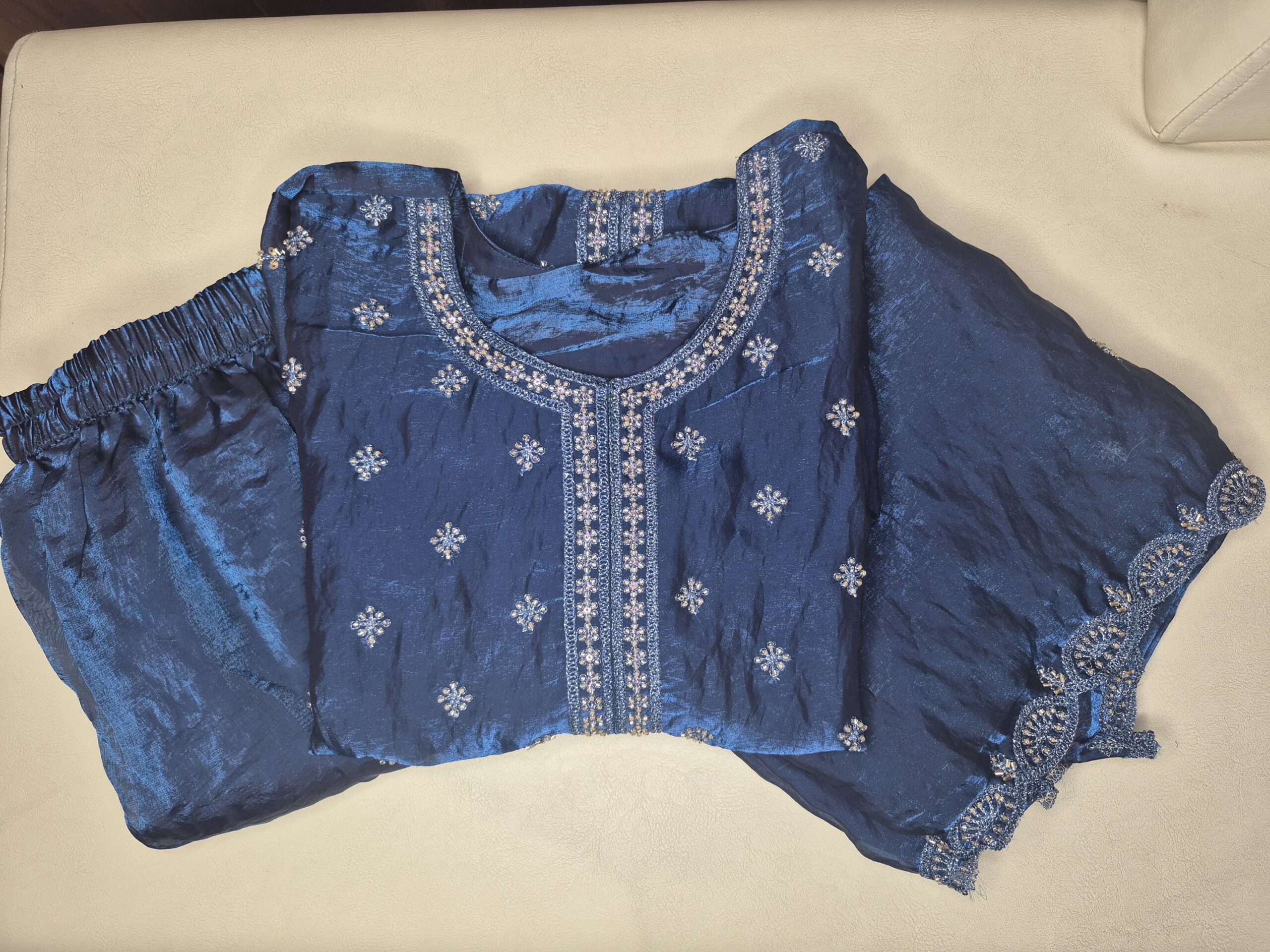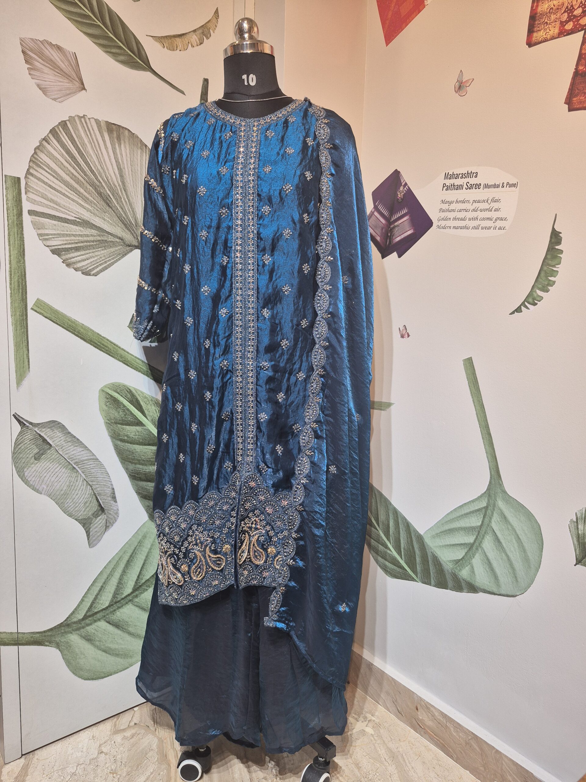 This elegant churidar set features a rich regal teal blue base adorned with delicate embroidery and intricate detailing along the front and borders. The matching dupatta with ornate designs adds a touch of sophistication, making it perfect for festive or formal occasions.