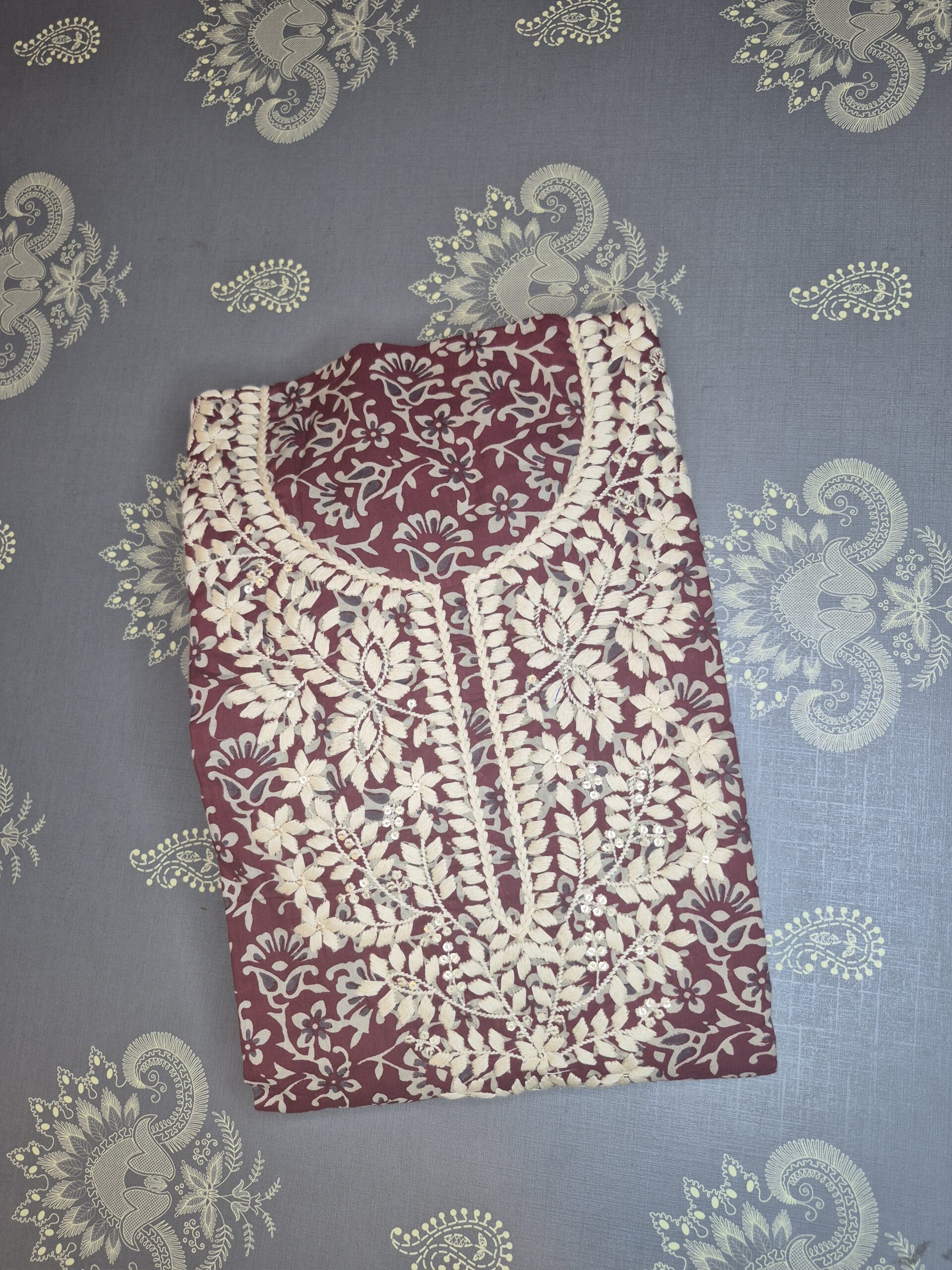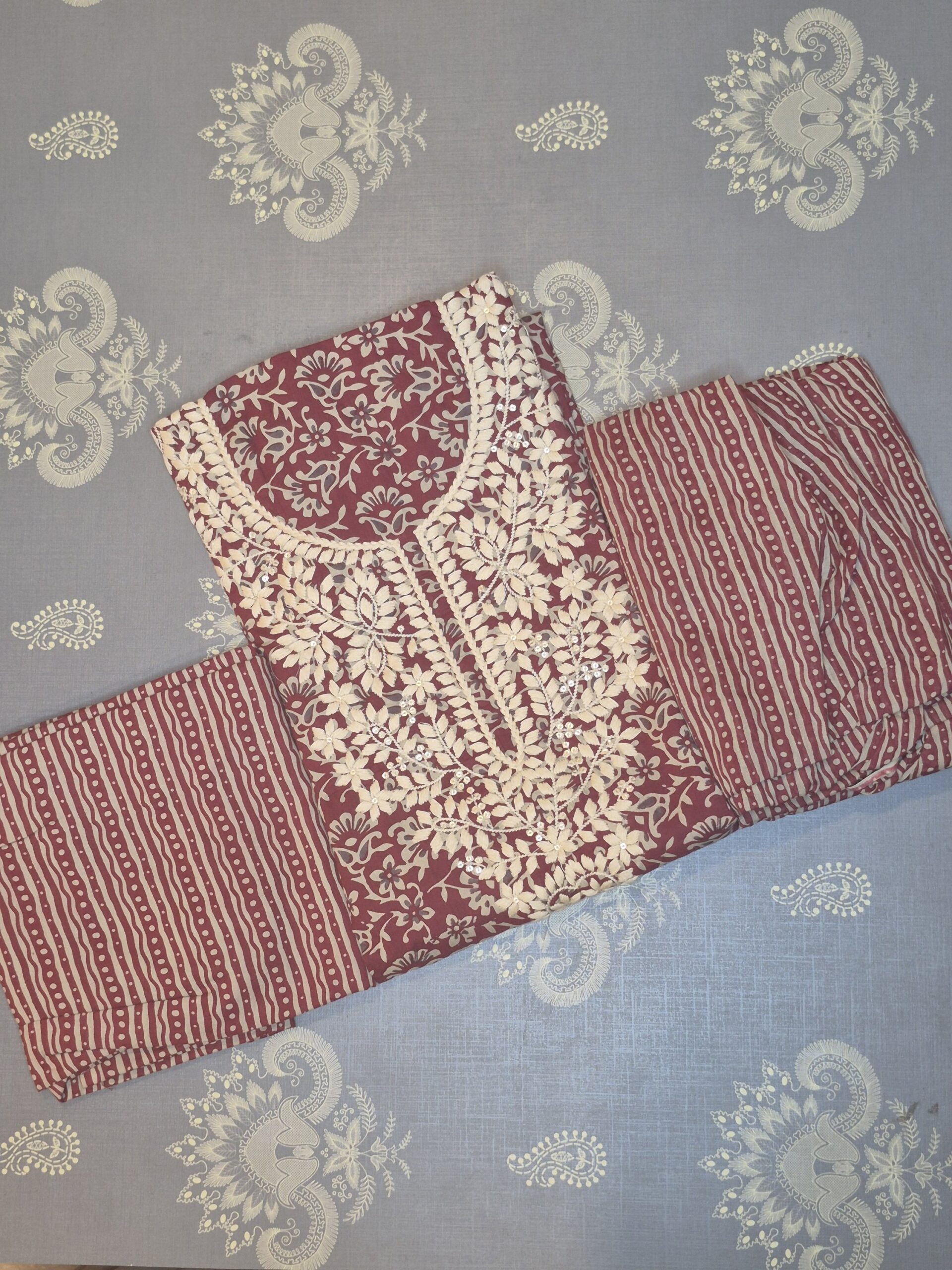 Deep maroon fabric featuring a delicate all-over floral print.Elaborate cream thread embroidery in a floral vine pattern, accented with small, shimmering sequins.Coordinating fabric with a wavy striped (Leheriya) pattern and circular dot motifs in maroon and cream.A perfect blend of ethnic charm and modern sophistication, suitable for office wear or festive gatherings.