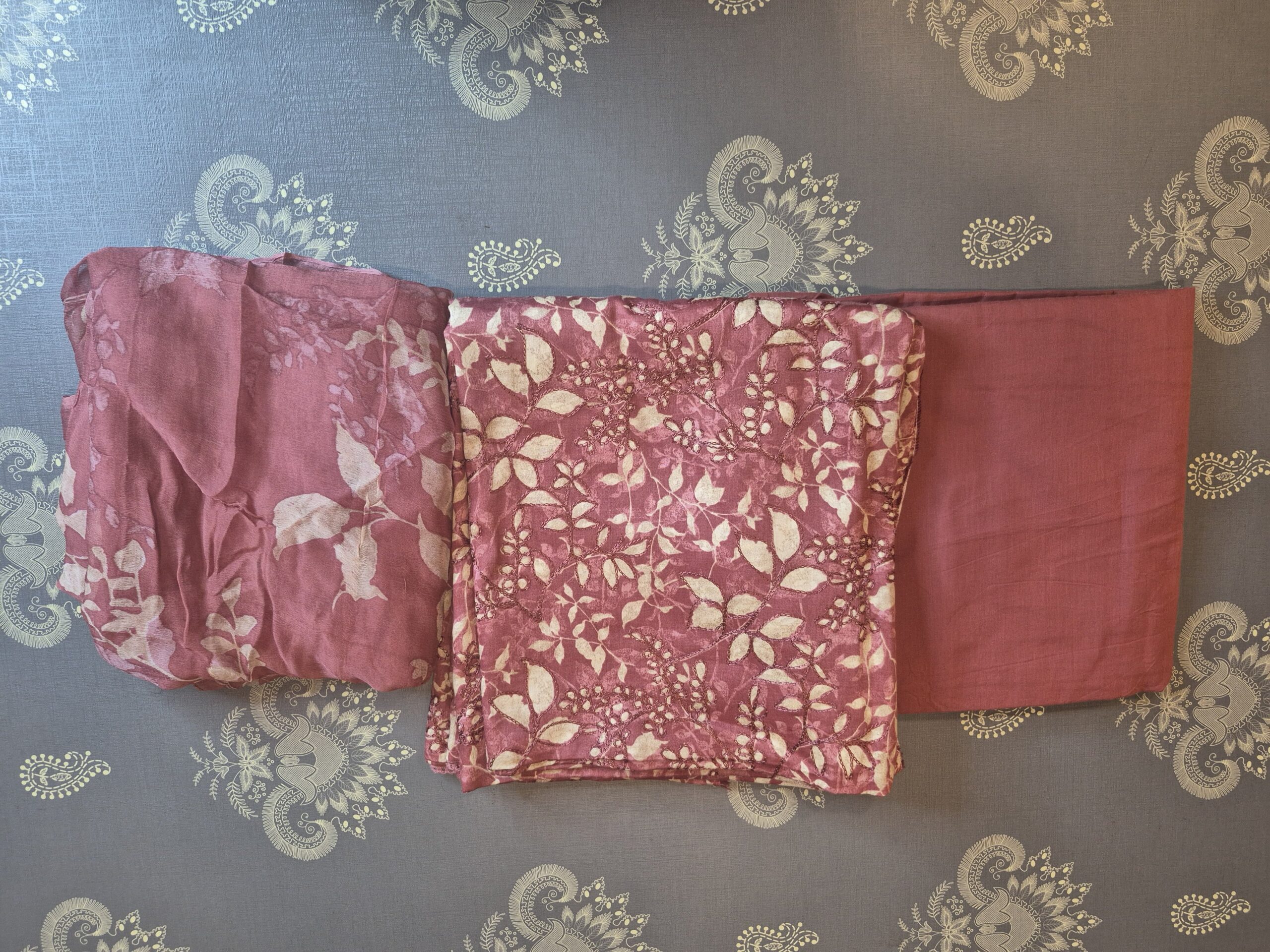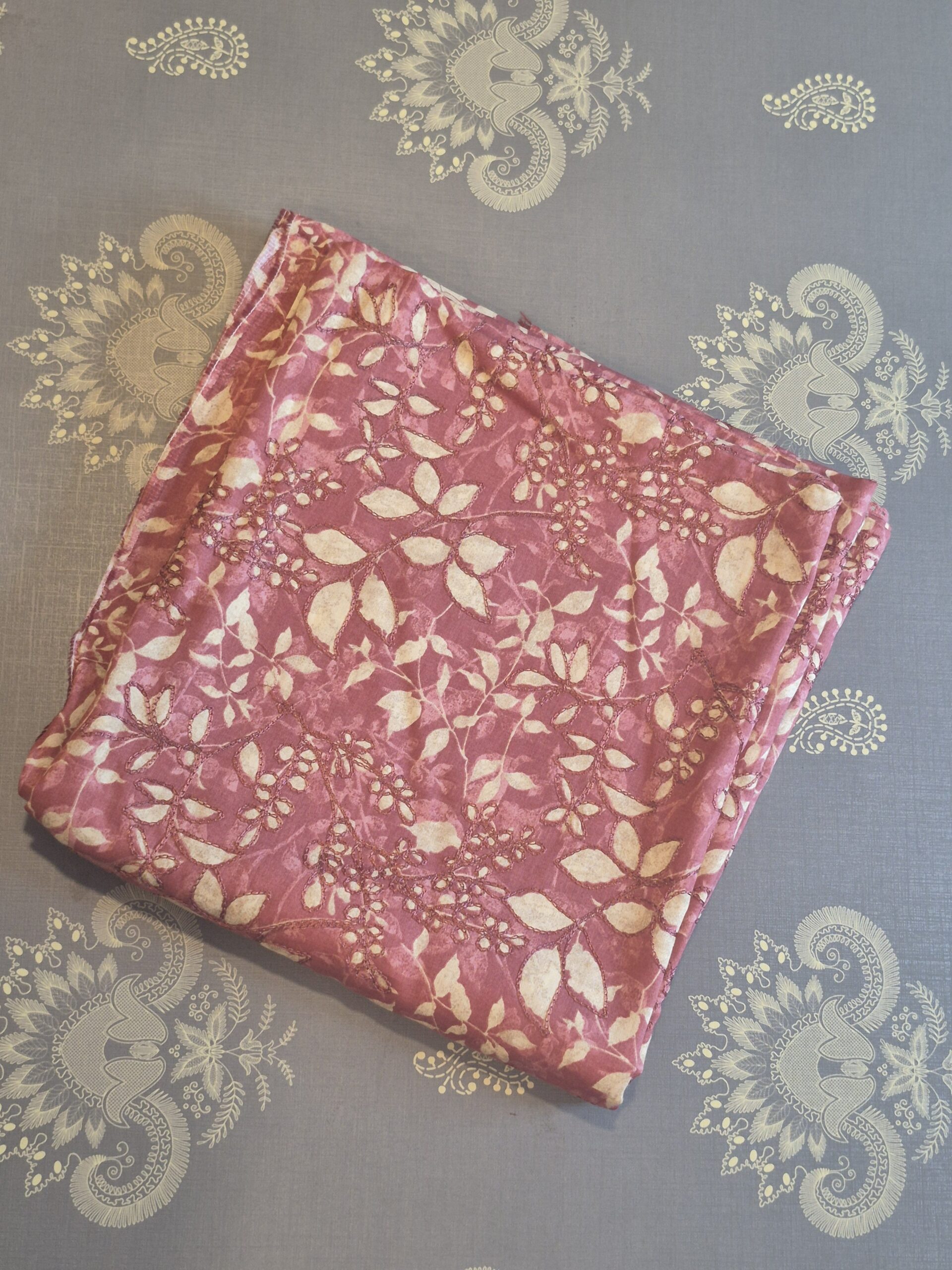 This unstitched churidar set in a soft mauve and cream palette offers a graceful, understated look for everyday elegance.Features a delicate, all-over floral and leaf print on a cream cotton base.Includes a matching solid mauve fabric designed for comfort and versatility.A lightweight, flowy dupatta with a large-scale coordinating floral pattern that ties the ensemble together.A perfect choice for office wear, daily errands, or casual tea sessions.