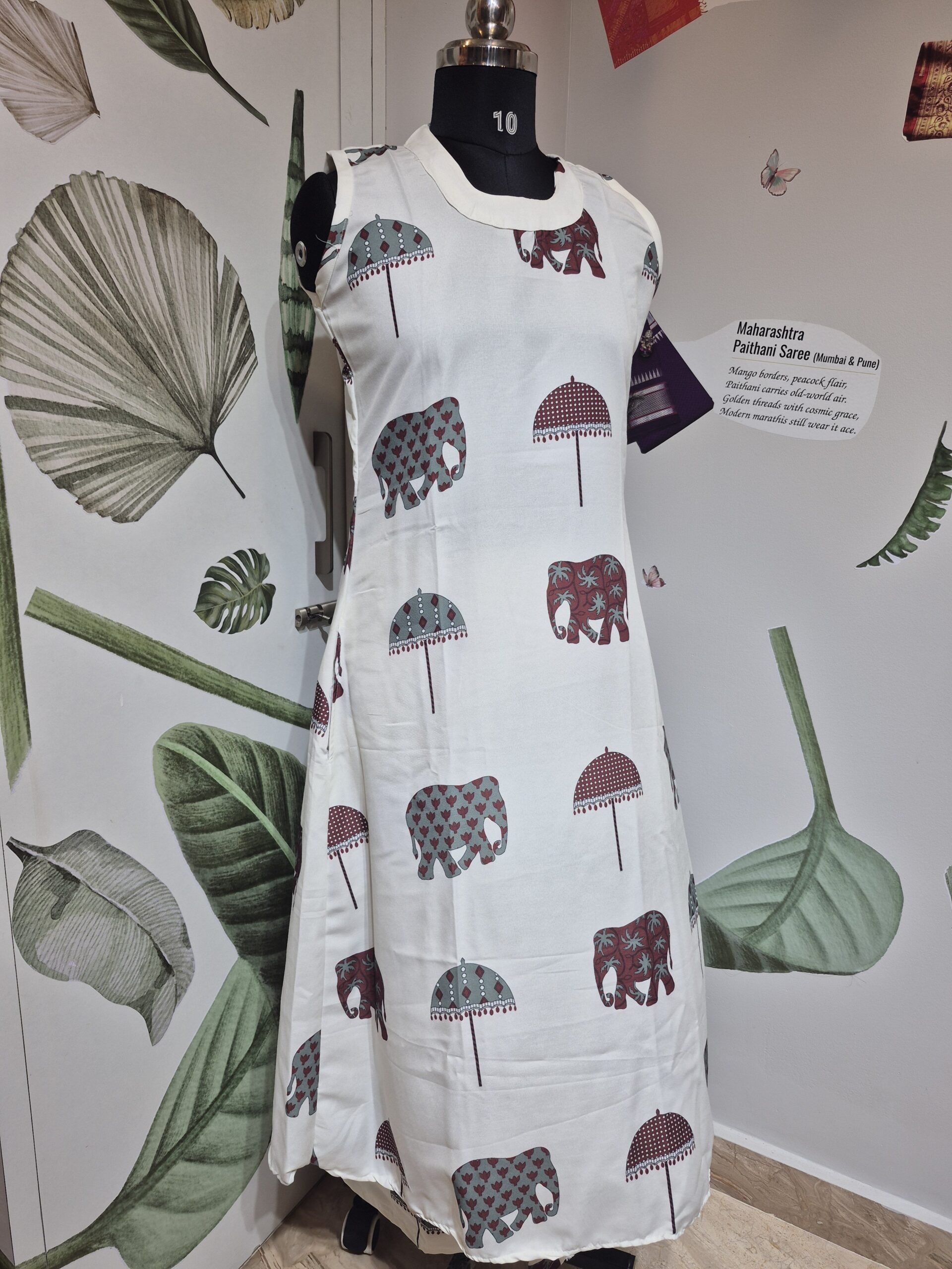 This is a stylish, sleeveless, white A-line kurti paired with matching bottoms, featuring a distinctive, playful print of stylized elephants and umbrellas in shades of maroon and teal. The light fabric and flowing, asymmetrical hemline give it a contemporary and comfortable summer resort wear aesthetic.