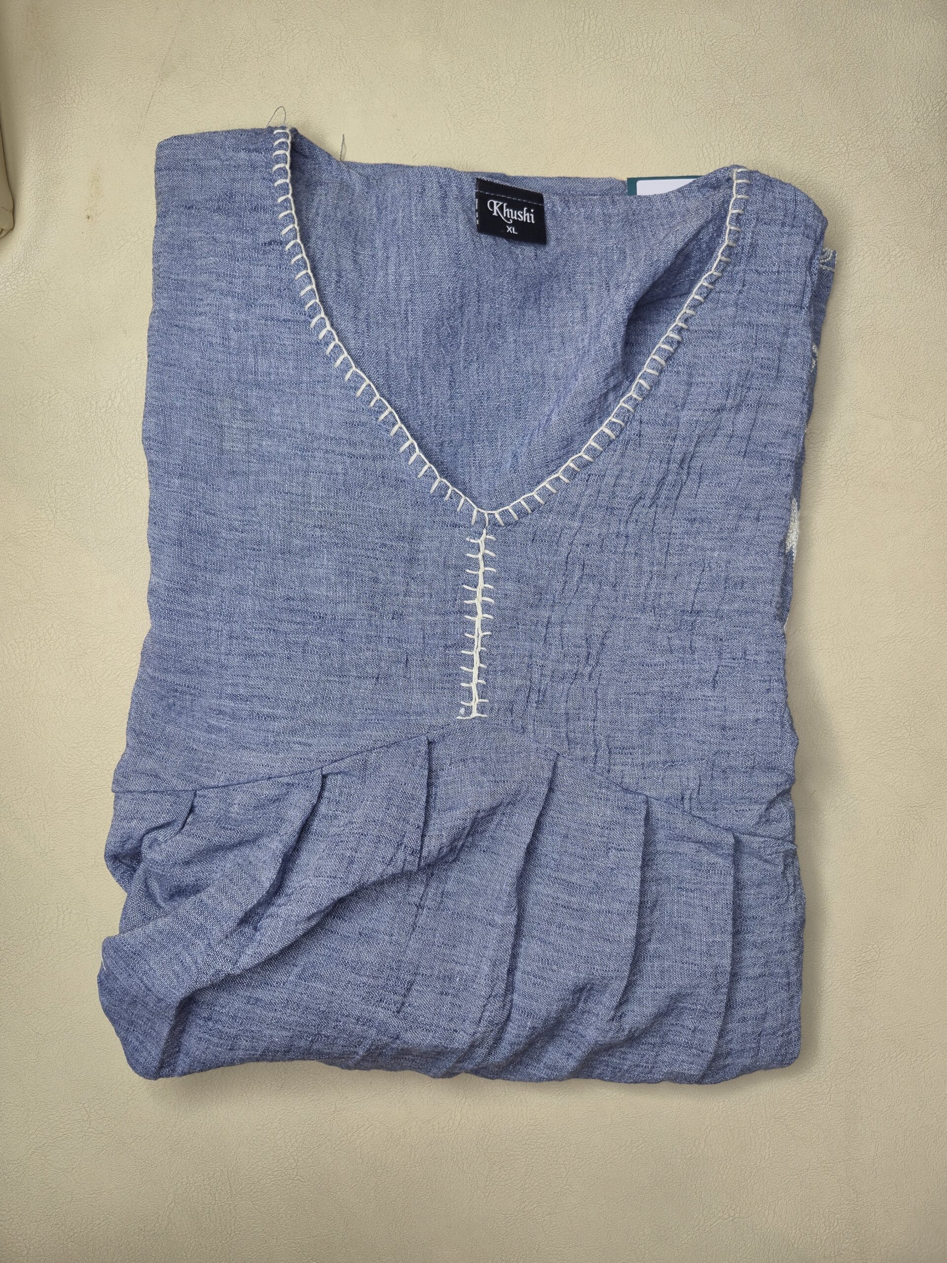 Dusty blue, short tunic top with an empire-waist peplum cut and three-quarter sleeves. It features an embroidered V-neck and a bold white floral/paisley embroidery pattern along the scalloped hemline. The fabric has a textured, slub, khadi, finish.