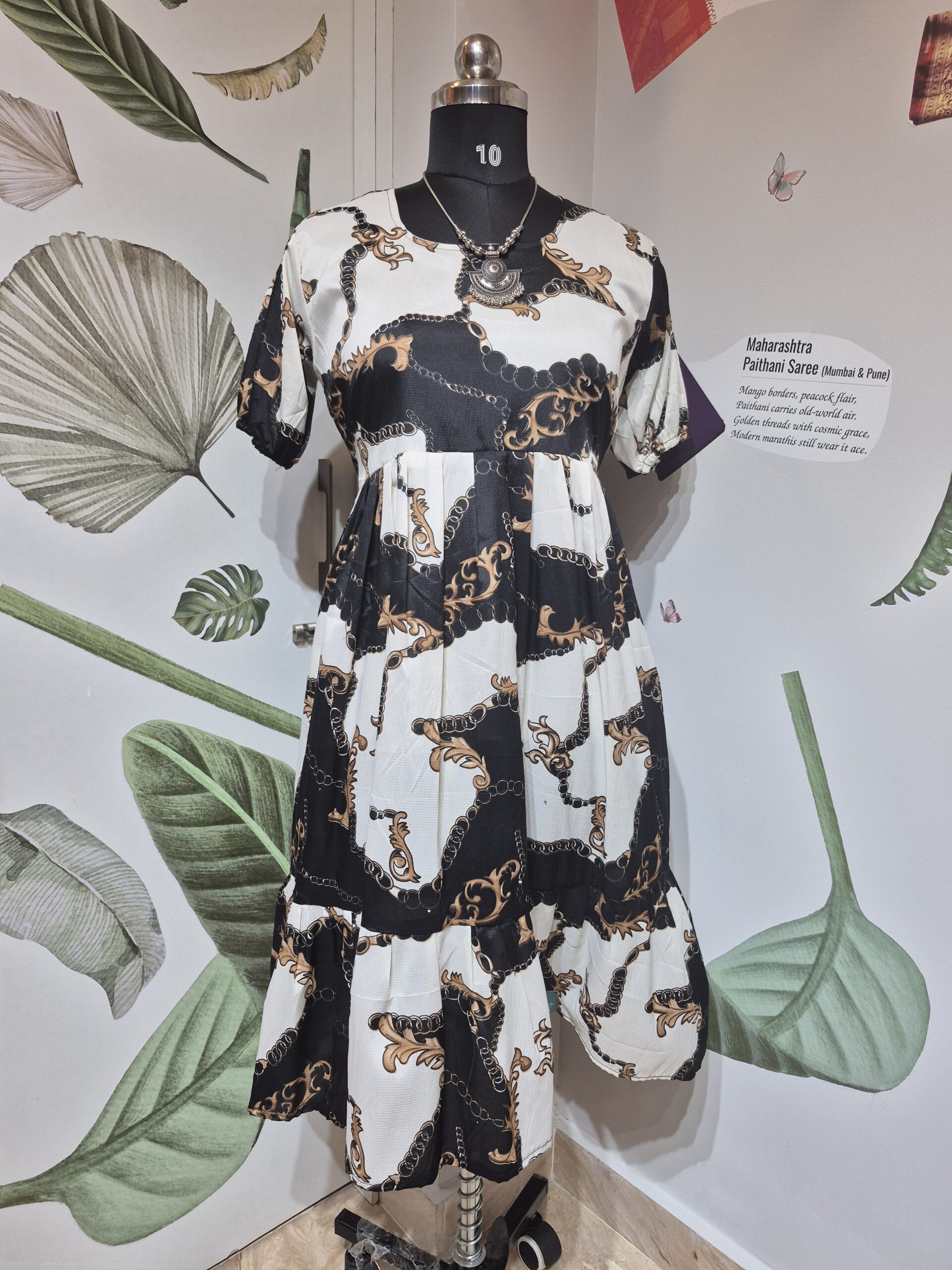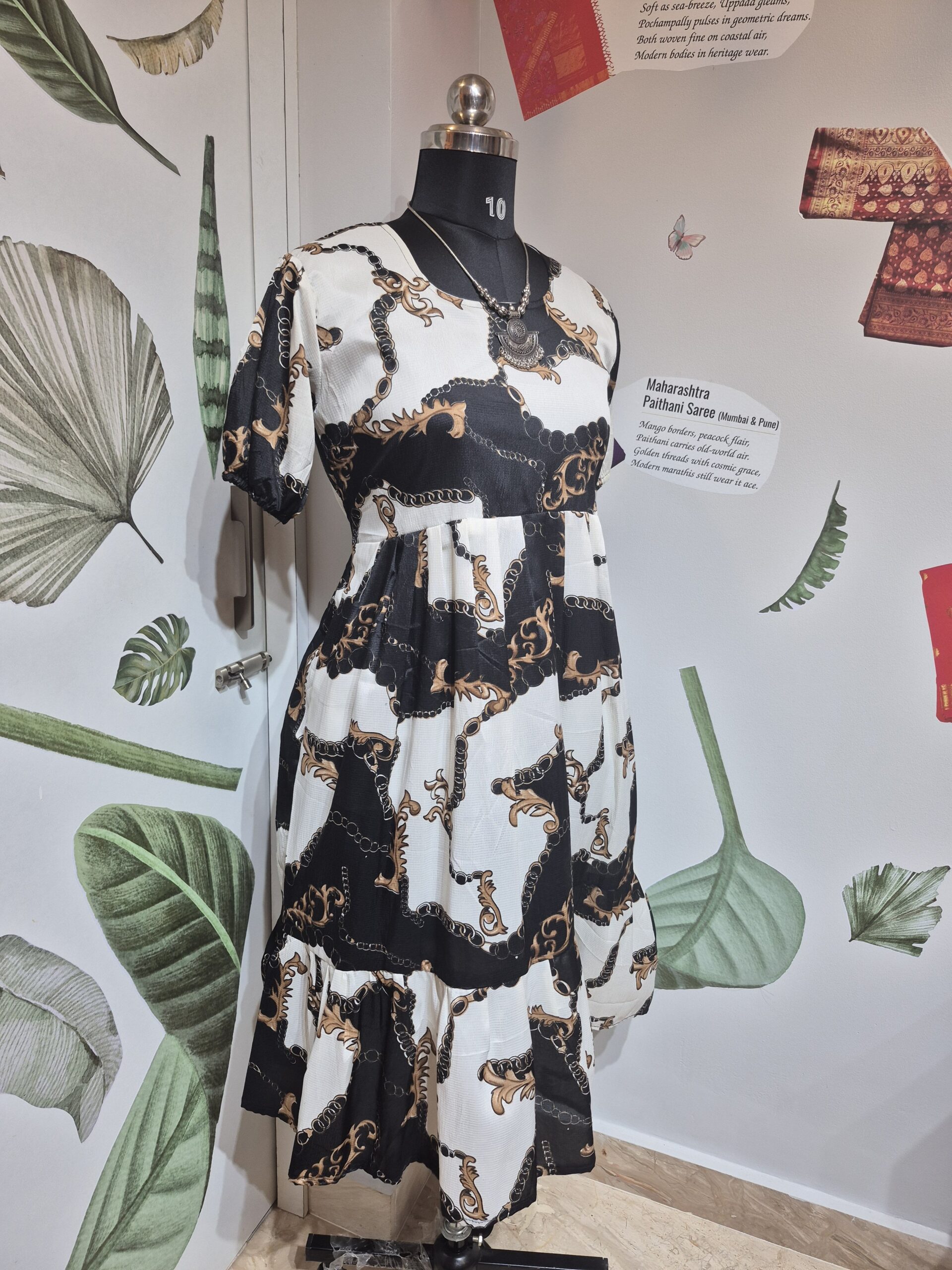tiered fit-and-flare frock featuring a striking black, white, and metallic gold baroque chain print. It has a round neck and short sleeves, making it a stylish and versatile piece for casual or semi-casual wear.