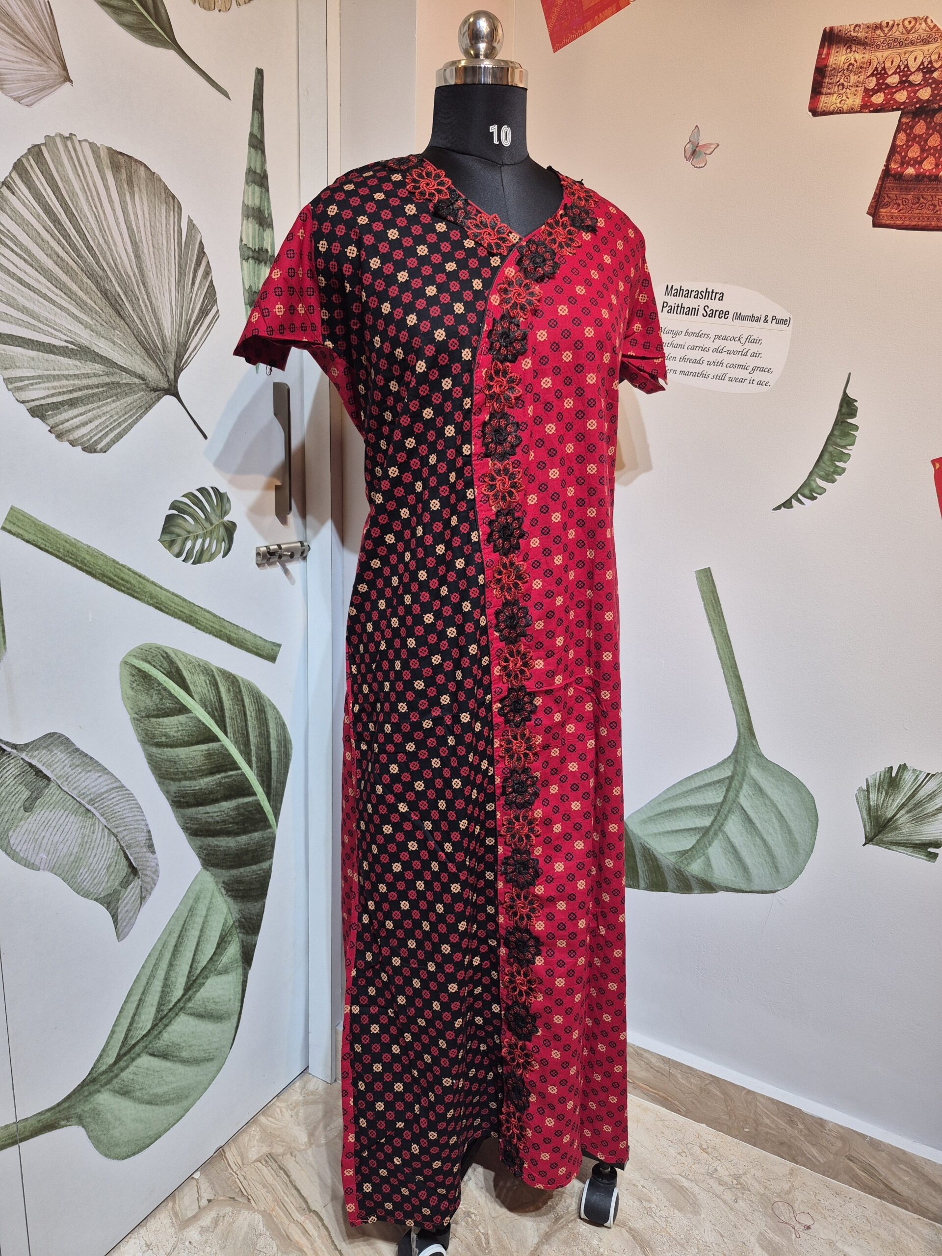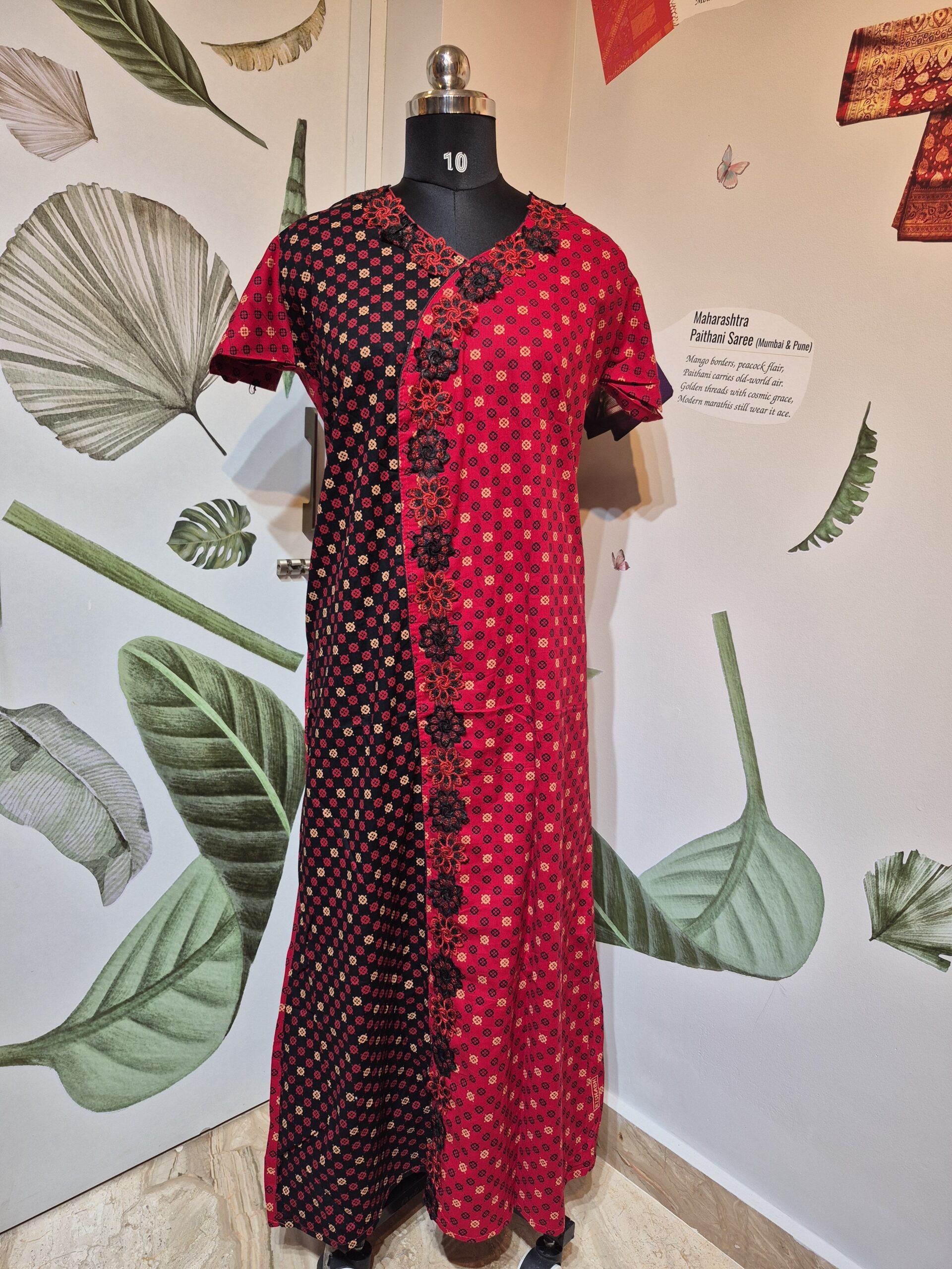 A full-length maxi dress with an overlapping V-neck design, featuring a dual-tone split of red and black with an all-over small geometric print. The two halves are divided by a striking vertical line of dark floral embroidery.