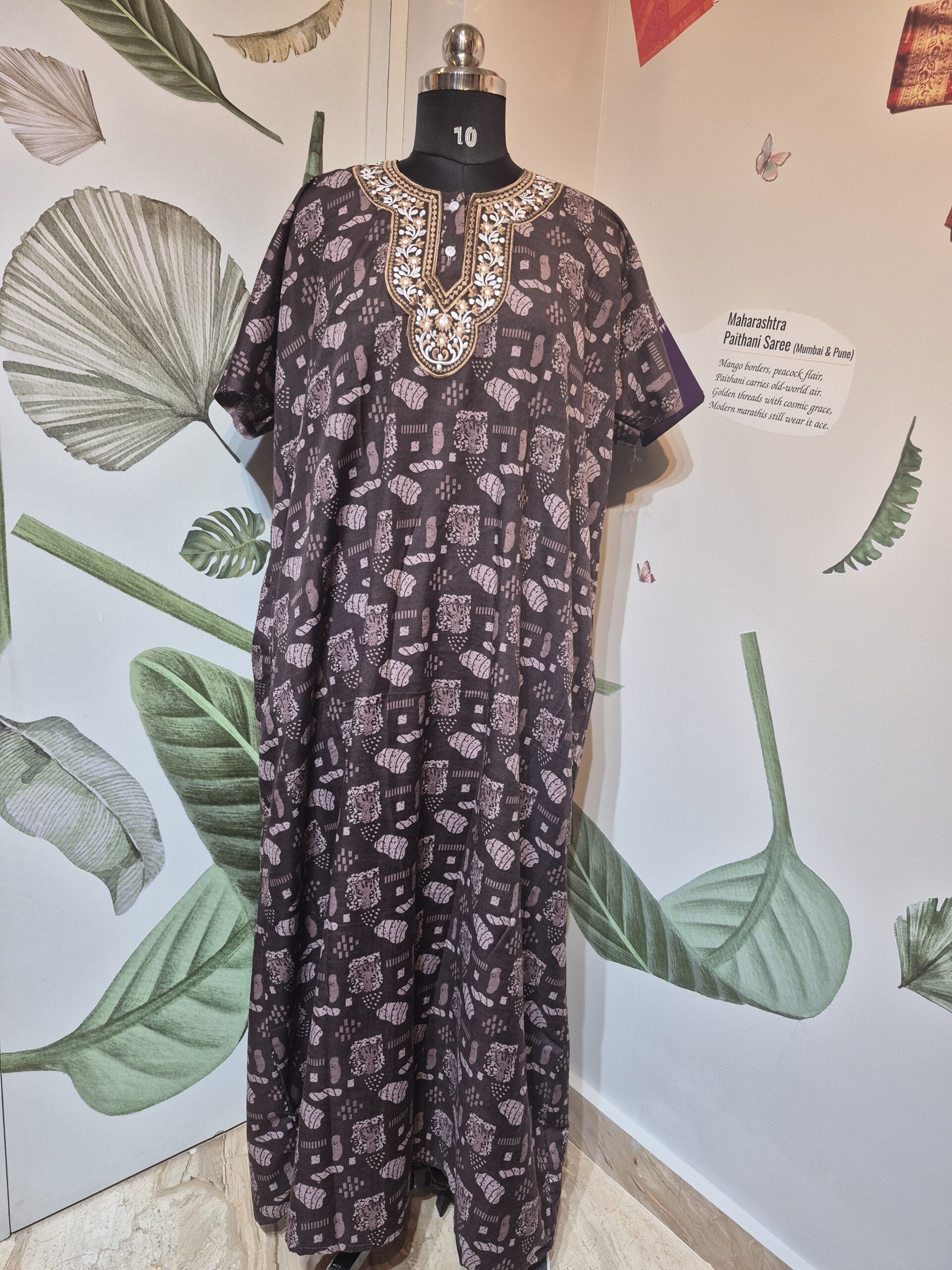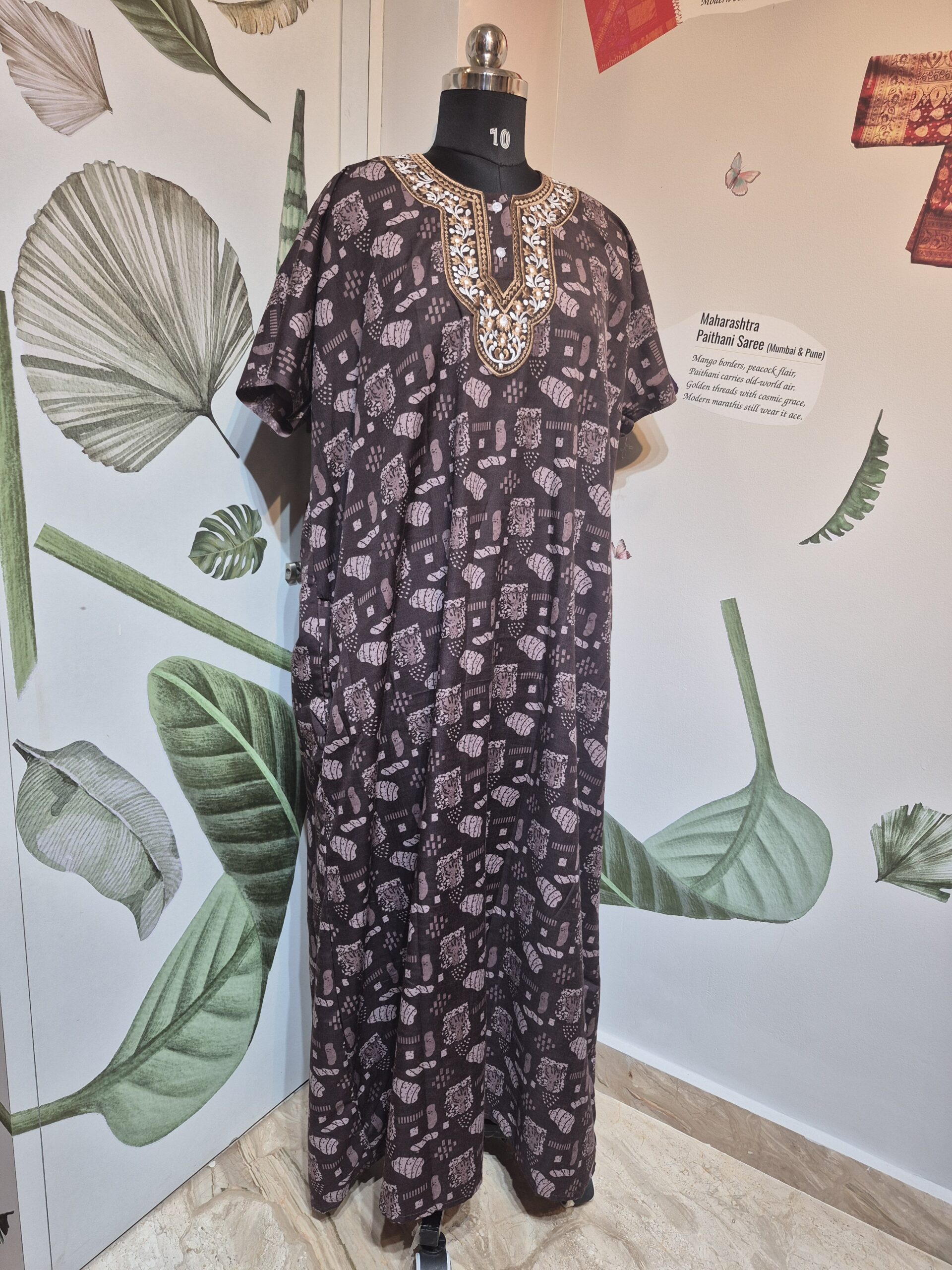 Elegant dark brown cotton maxi featuring an all-over geometric print. The main focus is the heavily embroidered yoke detail, which is embellished with intricate gold and cream threadwork for a sophisticated finish. Designed with short sleeves and a relaxed, comfortable fit.