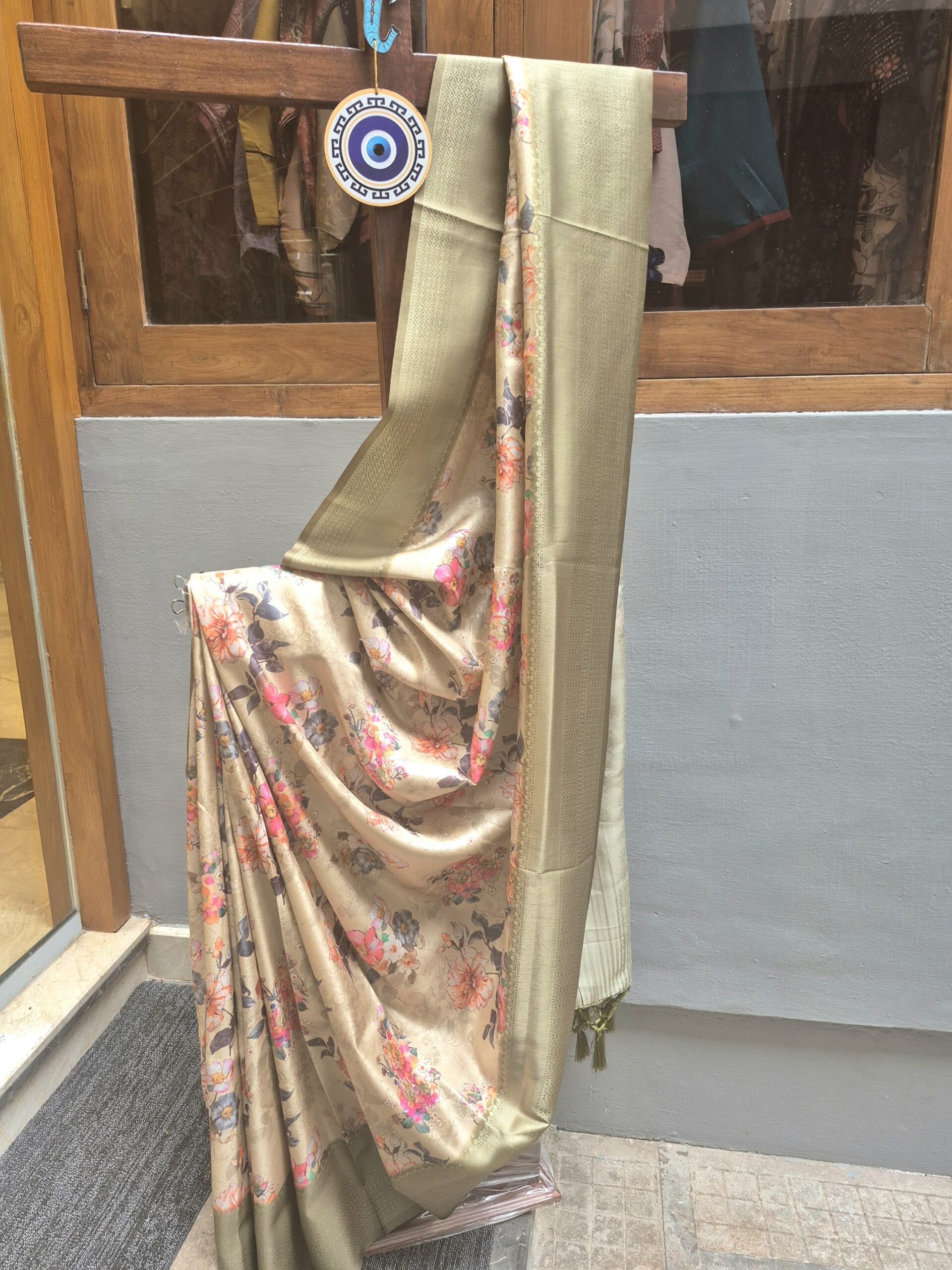 A stunning fusion saree featuring a soft beige base with a vibrant digital floral print and a contrasting, broad moss green border woven with traditional Zari work. The smooth fabric gives it an elegant drape, blending modern style with classic tradition.