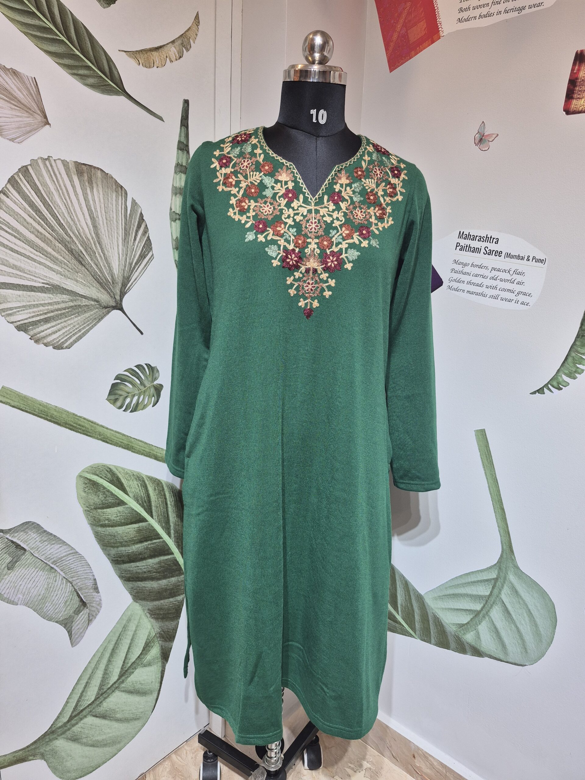 This is a rich emerald green straight-cut kurti with full sleeves, made from a plush fabric like velvet . It features a deep V-neck and a dense, multicolored floral and vine embroidery design on the entire yoke in shades of maroon, mustard, and gold, offering a luxurious and ready-to-wear winter ethnic look.