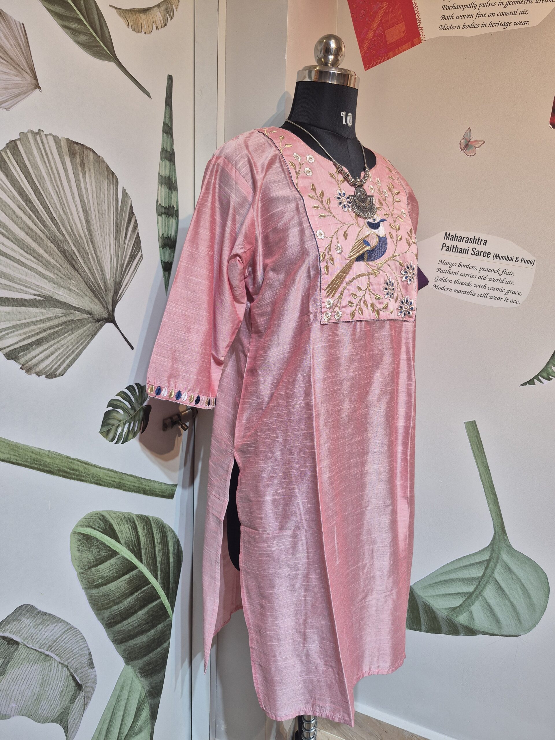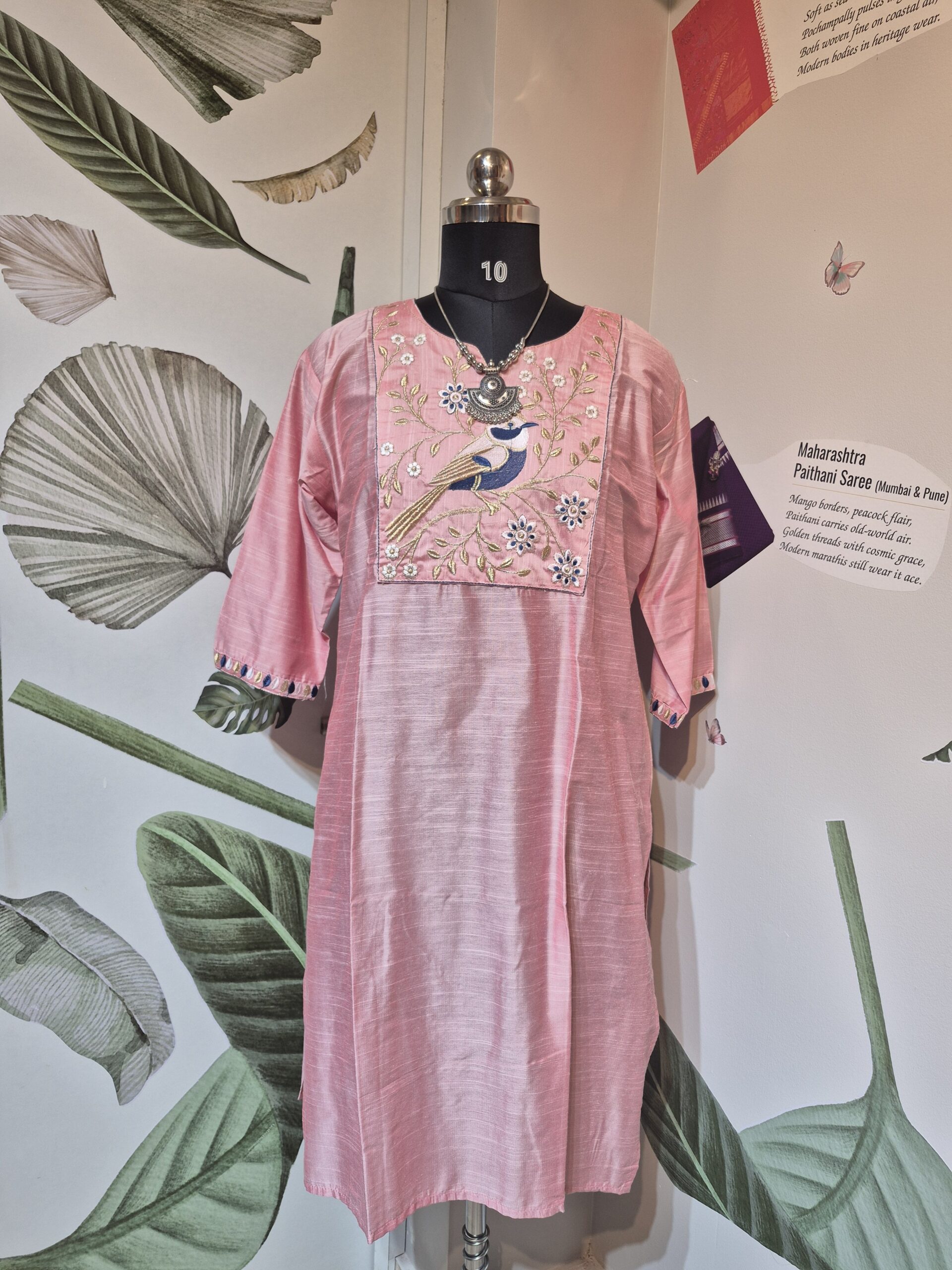 Elegant pink silk kurta featuring exquisite hand-embroidery of a blue and gold bird motif on the yoke. Made from a subtly textured silk blend, this three-quarter sleeved tunic offers a rich, semi-formal look perfect for festive or special occasions.