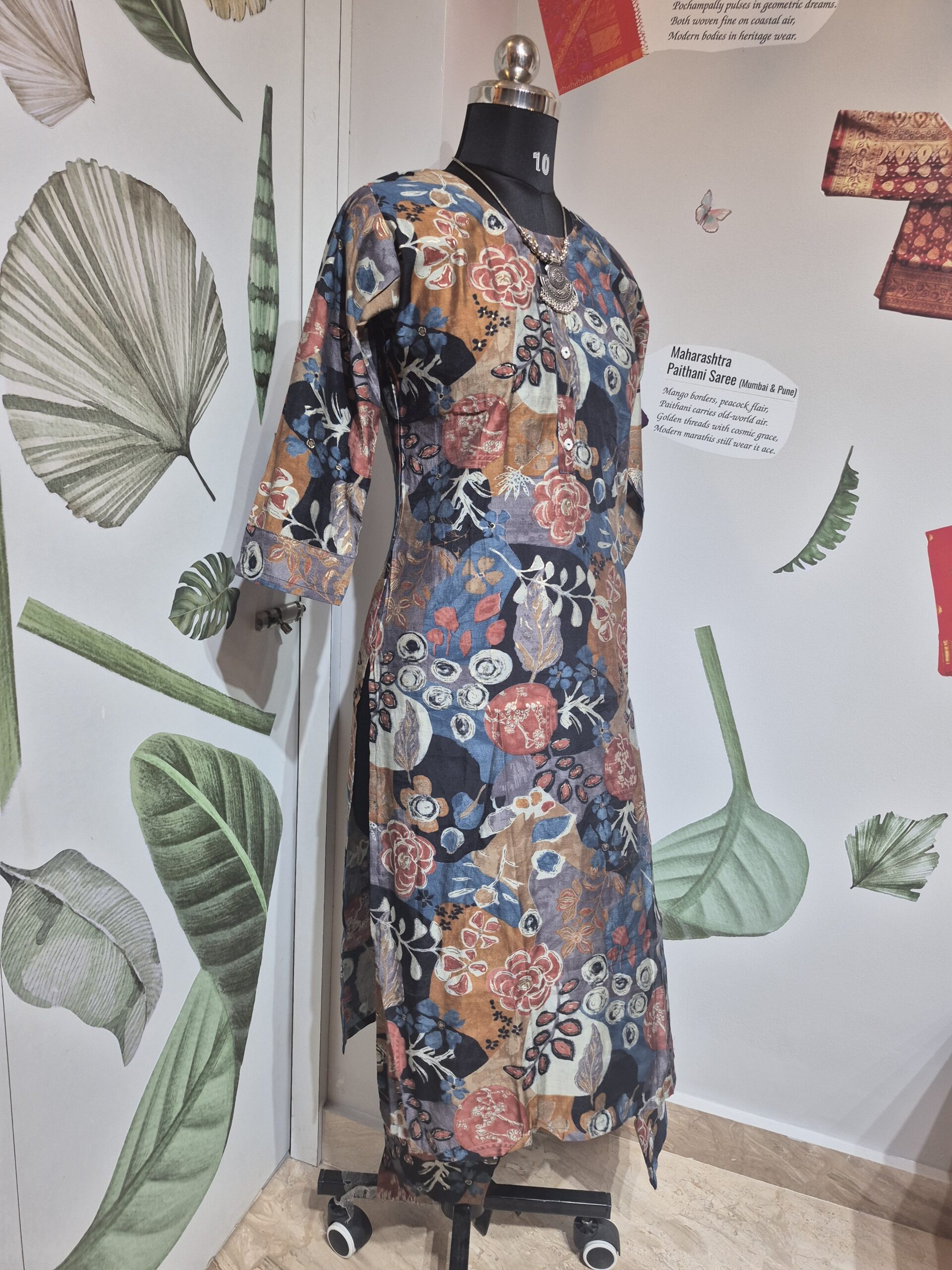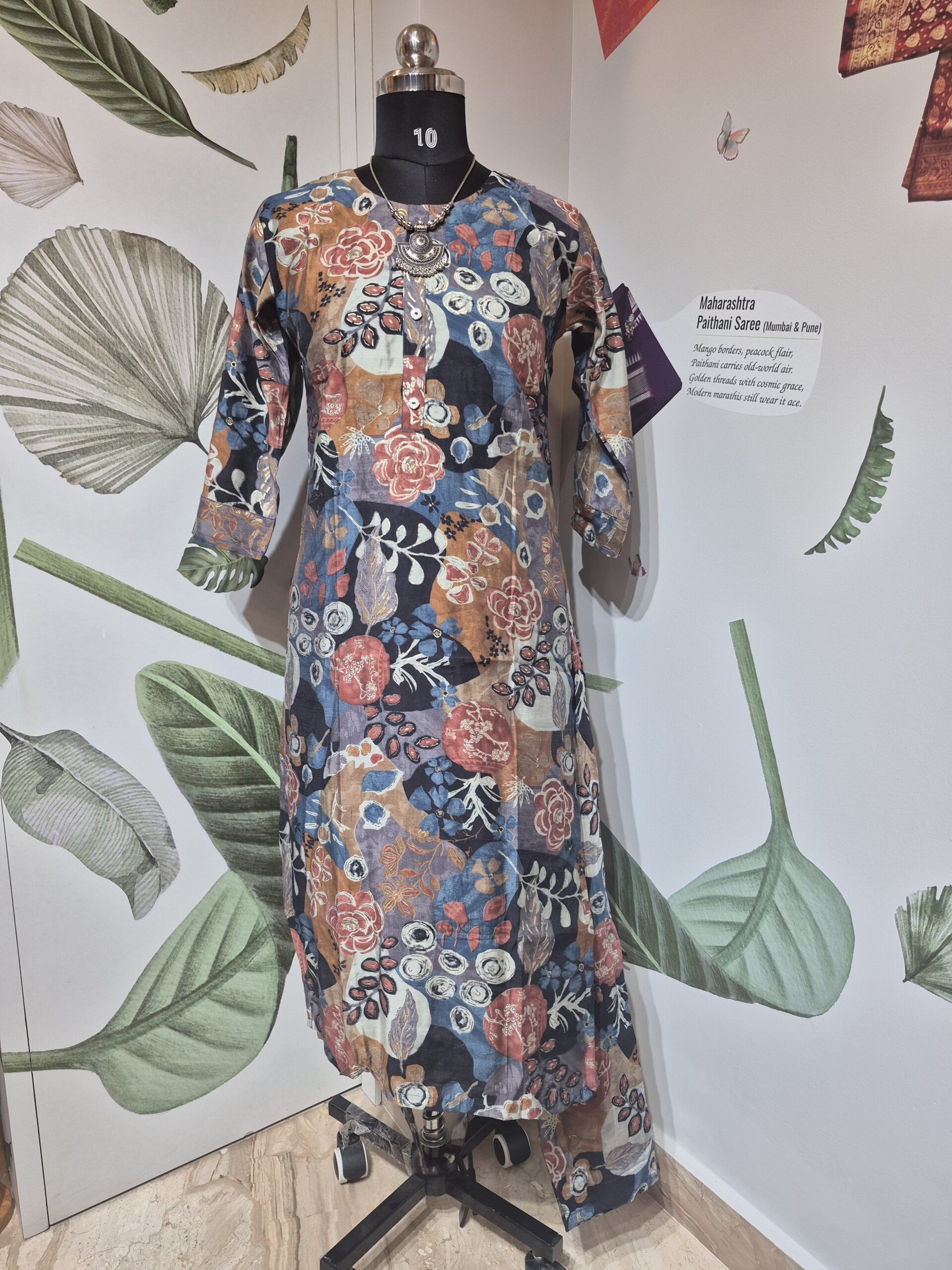 A straight-cut kurta in a dark base color featuring a dense, multi-colored autumnal floral print , styled with a three-quarter sleeve and a modern asymmetrical hemline and paired with same pattern bottom .