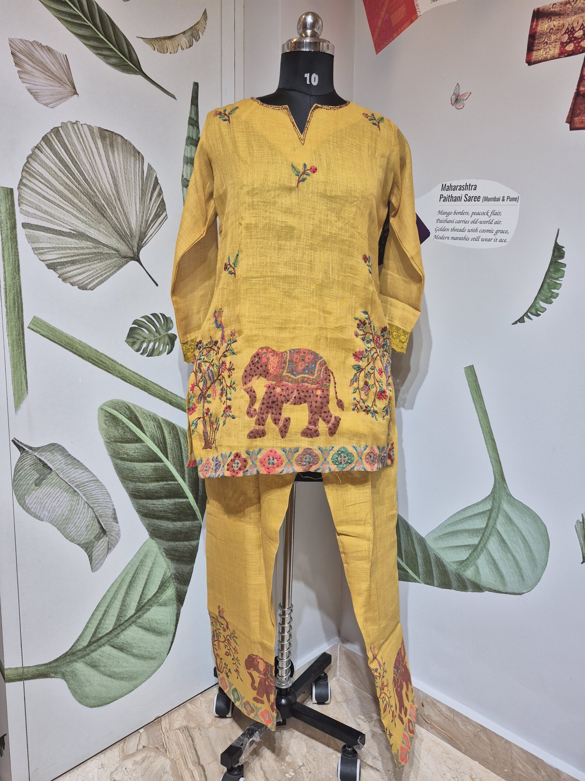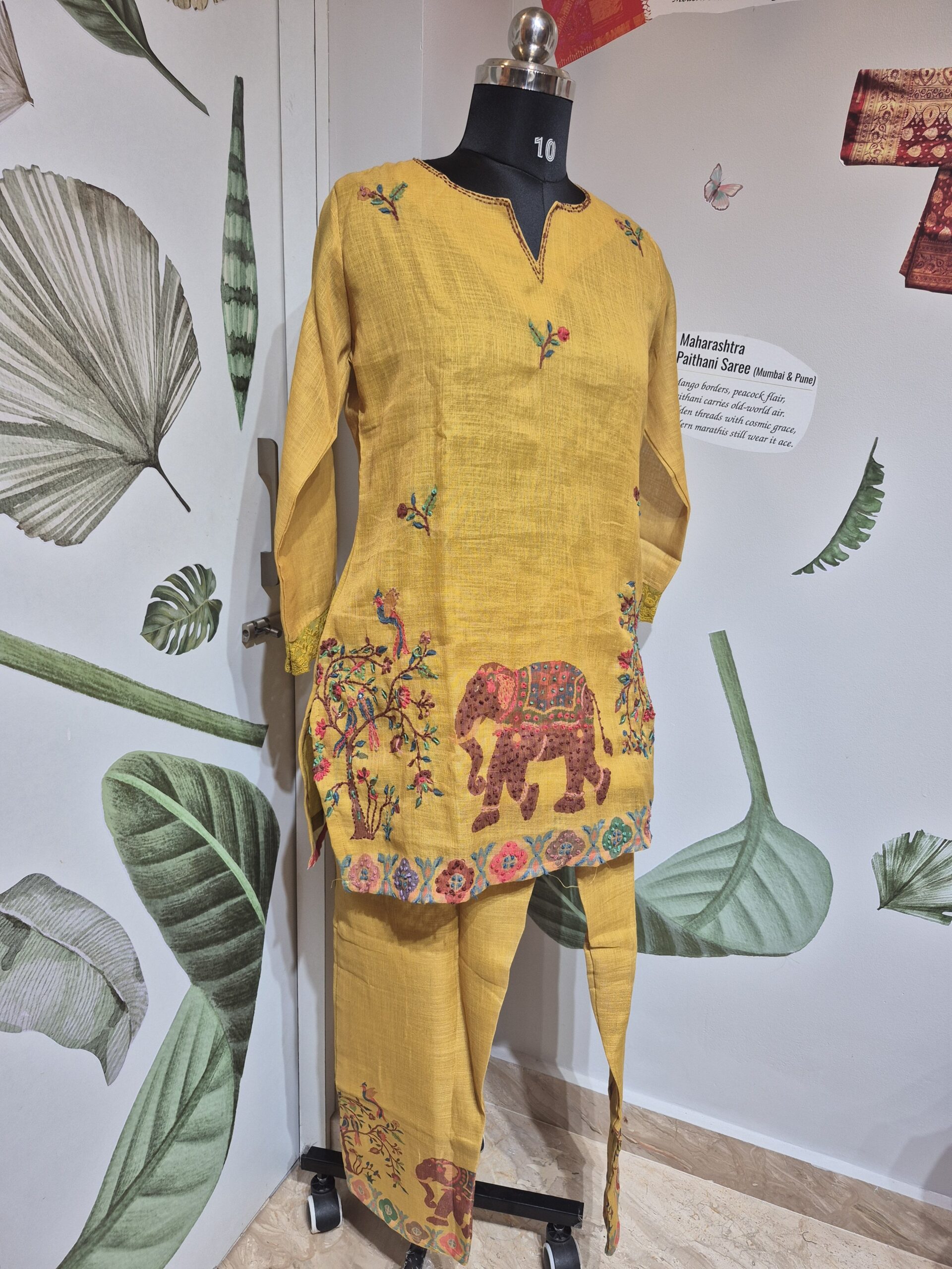 This is a bright mustard yellow two-piece ensemble in a textured fabric (slub). The straight-cut kurti features a large, multicolored embroidered elephant motif and a decorative border above the hem. It is paired with matching straight trousers that also have coordinated elephant embroidery near the cuffs, creating a festive and contemporary ethnic look.