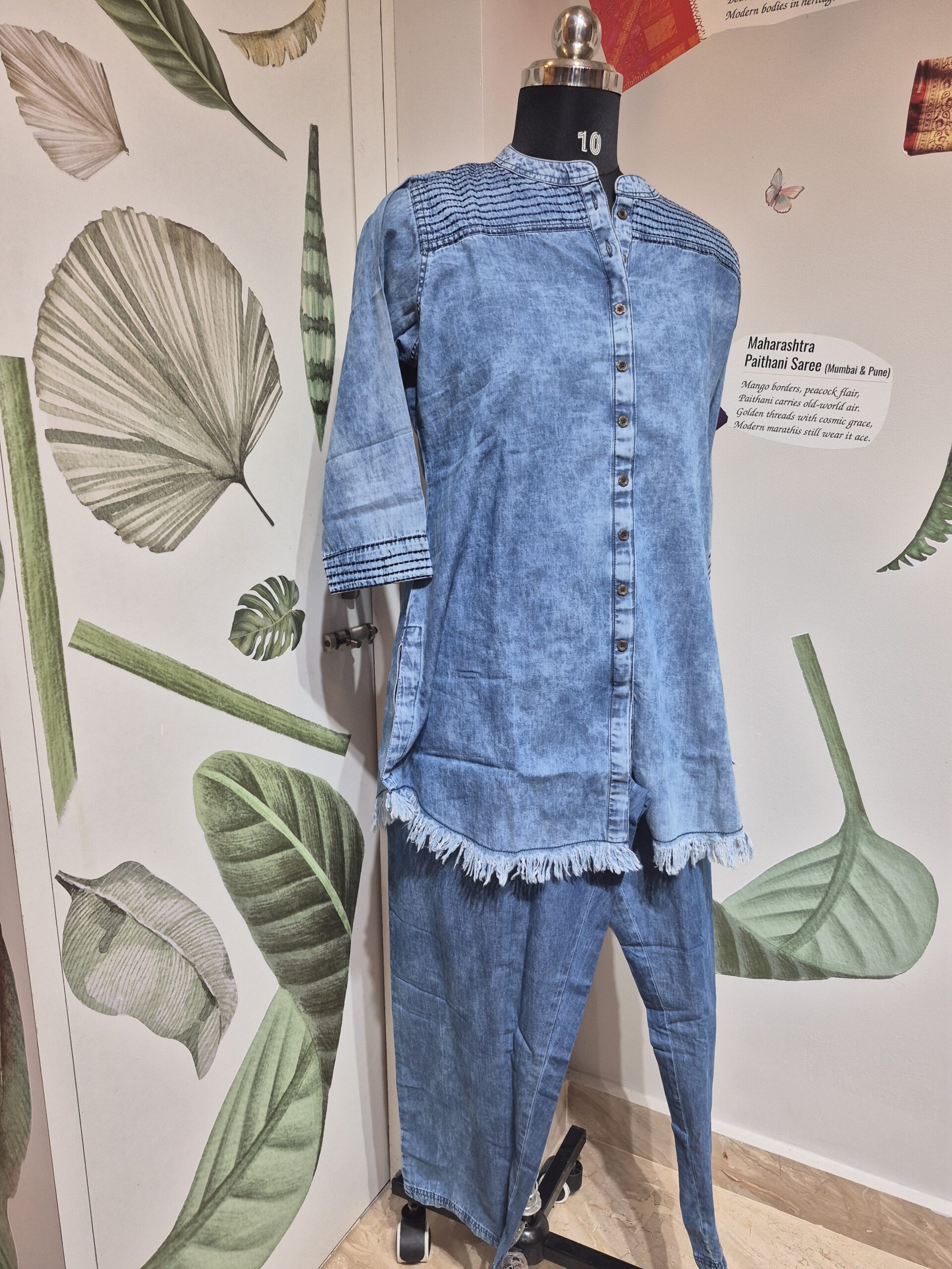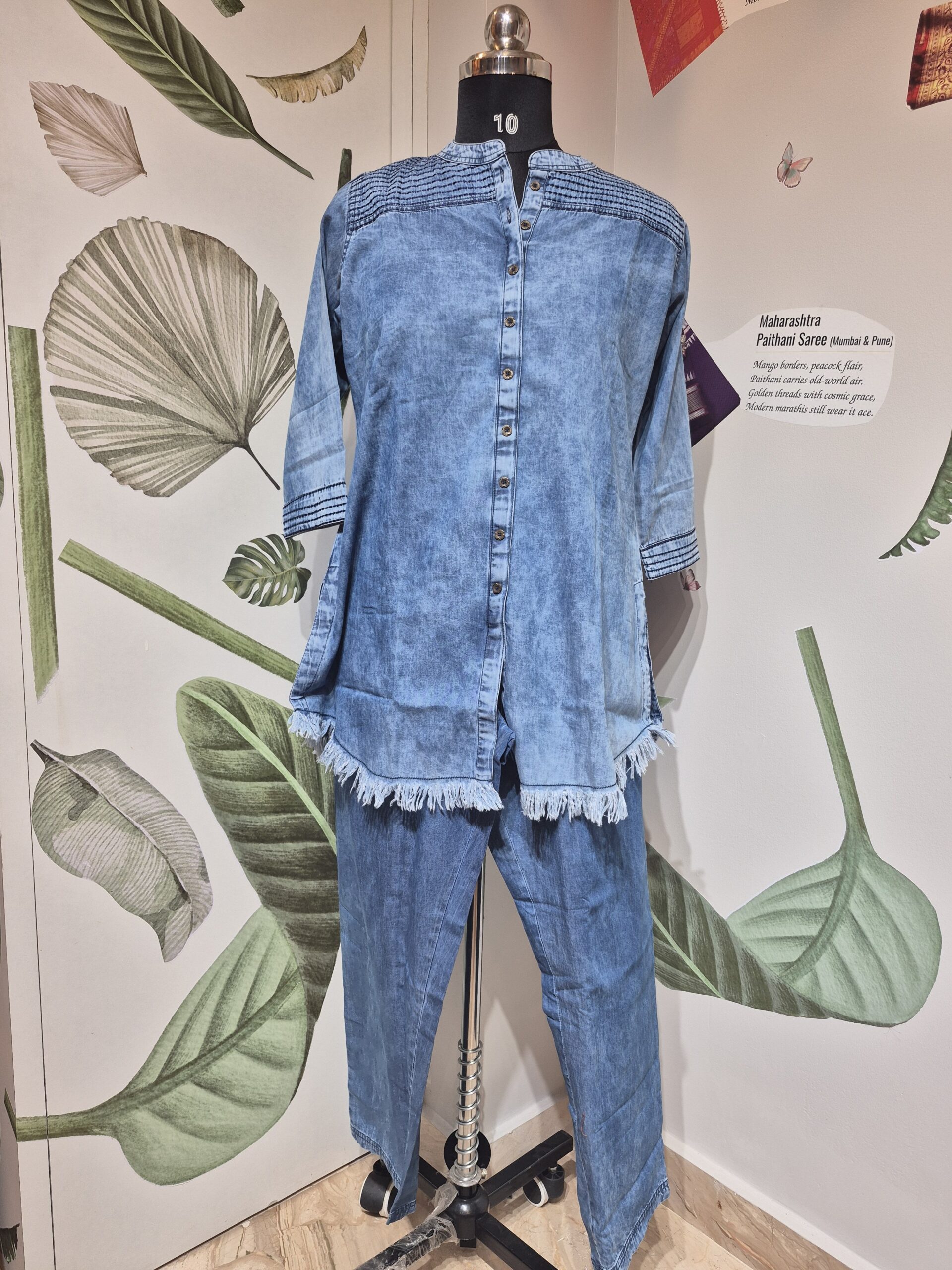 A casual, blue denim co-ord set featuring a tunic with a mandarin collar, frayed hem, and smocking detail on the yoke, paired with matching straight-leg trousers.
