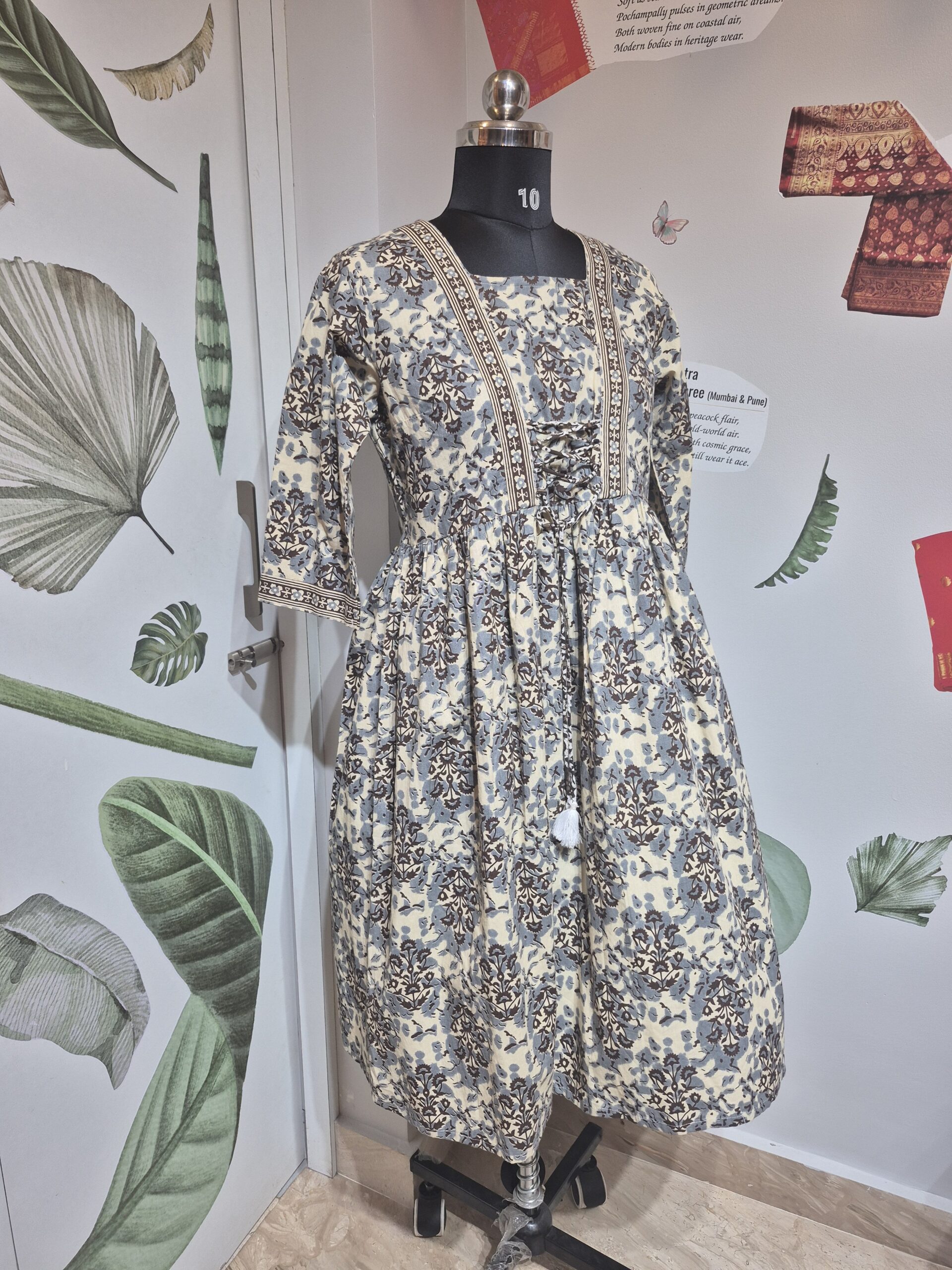 This cream-based flared frock features an intricate botanical print in slate blue and chocolate brown. The design is highlighted by a unique corset-style lace-up detail on the bodice, framed by vertical geometric borders. With its square neckline, three-quarter sleeves, and voluminous gathered skirt, this piece offers a perfect blend of rustic charm and contemporary bohemian style.